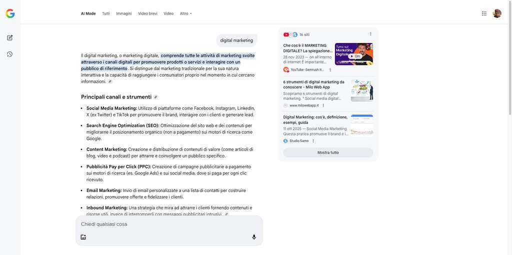 A differenza delle brevi Overviews, AI Mode offre un approccio conversazionale e approfondito: quando l’utente attiva questa modalità (tramite un pulsante o scheda dedicata, accanto alle schede “All”, “Images”, “News” etc.), la pagina di ricerca viene ripensata.