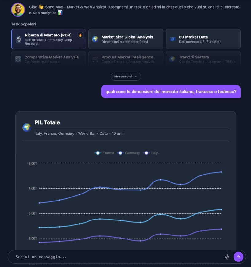 Grazie a specialisti virtuali (ognuno focalizzato su una specifica funzione del marketing digitale) puoi ottenere insight contestualizzati, piani d’azione concreti e contenuti mirati basati su segnali reali dal mercato.
